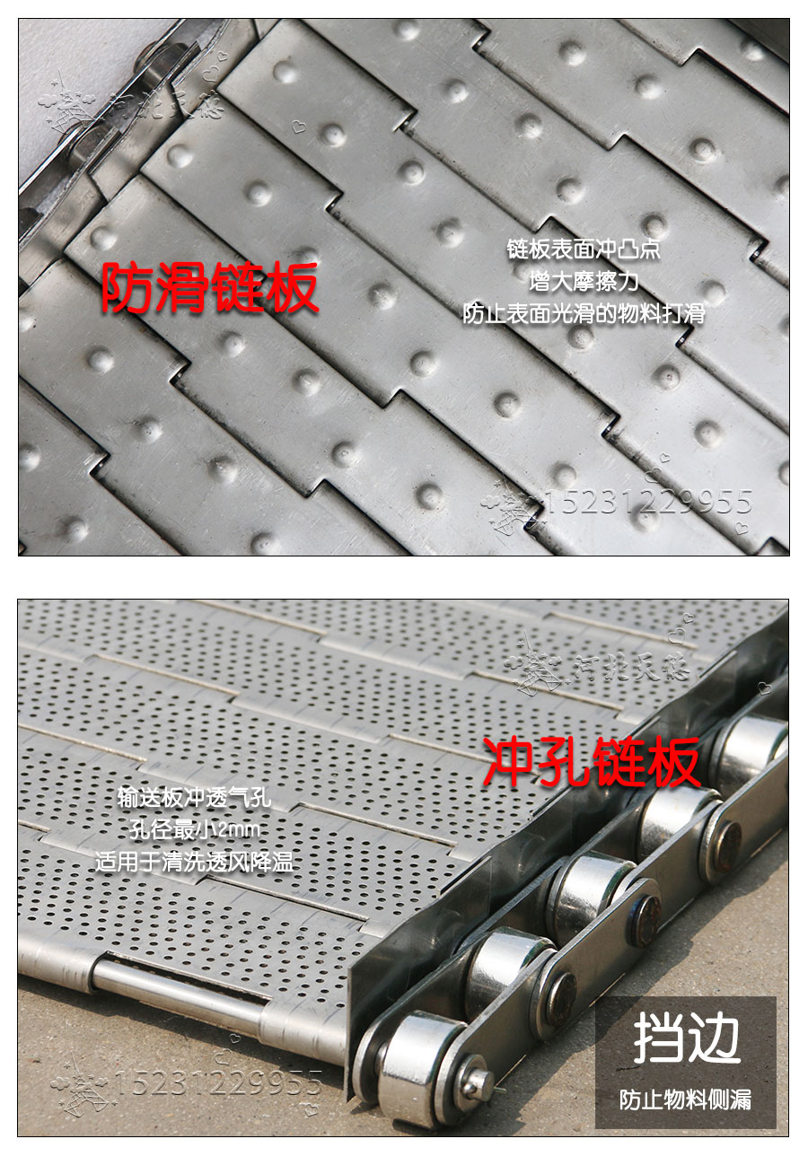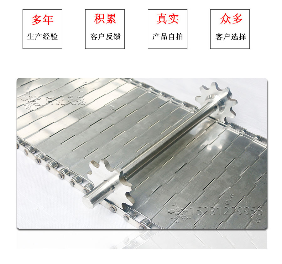 輸送鏈板非常堅(jiān)固由鏈條驅(qū)動(dòng)采用金屬板材生產(chǎn),適合用于輸送細(xì)小的高密度物件,輸送過(guò)程中運(yùn)轉(zhuǎn)平穩(wěn)安裝更換方便,成本相對(duì)較高使用壽命較長(zhǎng)用于中等和大負(fù)荷輸送。鋼板彎曲形成合葉,使用支軸將合葉和鏈條串在一起。兩端的鏈條可以使用開(kāi)口銷(xiāo)或者墊圈來(lái)固定,使用開(kāi)口銷(xiāo)方便拆卸,維護(hù)方便。