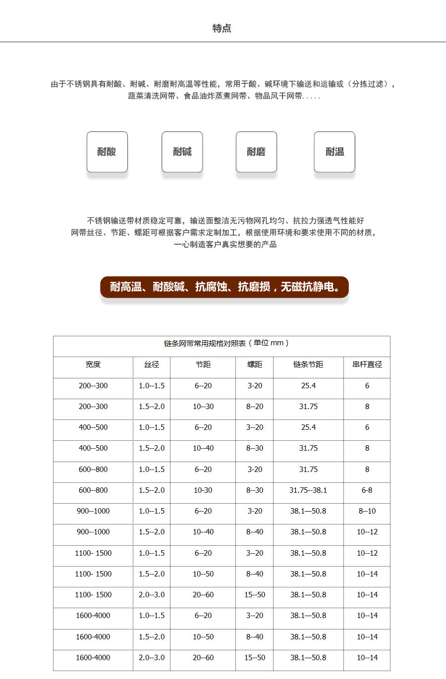 不銹鋼網帶屬于非標準件,我們將根據你提供的規格長寬,材質,絲徑,編制結構尺寸,支軸直徑,支軸間距,鏈條型號等數據核算成本和制作.