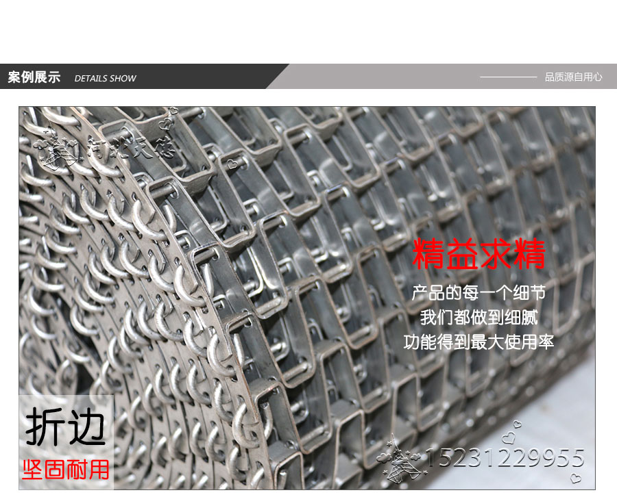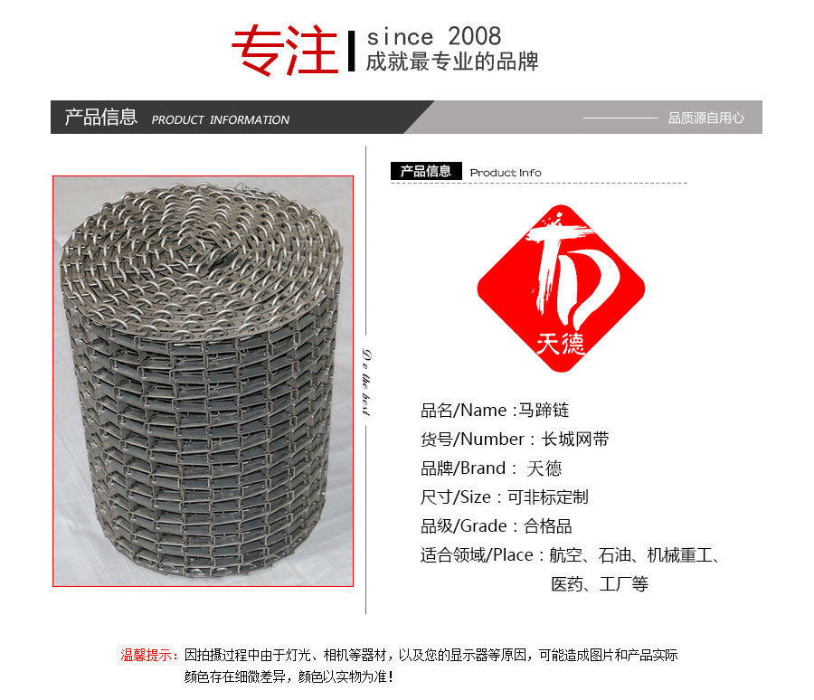 長(zhǎng)城網(wǎng)帶屬于非標(biāo)準(zhǔn)件,我們將根據(jù)你提供的板寬、板厚、上口寬度、下口寬度、串桿直徑、節(jié)距、材質(zhì)、邊緣處理方式等數(shù)據(jù)核算成本和制作.